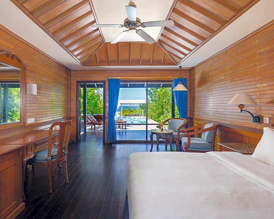 Beach Villa is 614 square feet and includes a king-size bed 150-183 width plus terrace, hairdryer, tea and coffee making facilities , and safe.